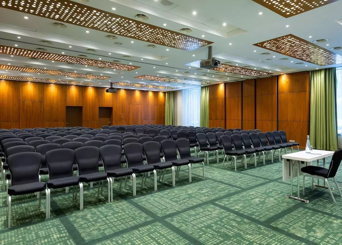 Также вас ждет многофункциональный зал «Москва», площадью 220 кв.м, вместимостью до 150 человек банкетной рассадкой. Пространство наполнено дневным светом и не имеет колонн. Зал оснащен современным аудиовизуальным оборудованием и имеет просторное фойе для проведения фуршетов и welcome drink. Он отлично подходит для организации банкетов любого формата.